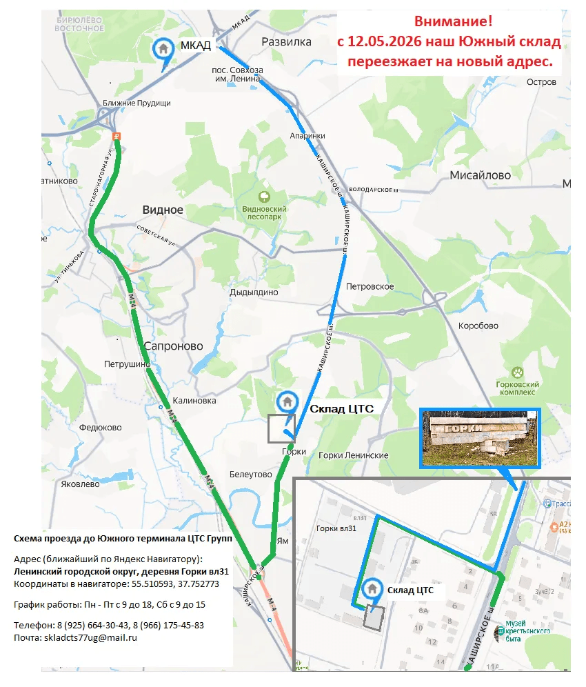 ВНИМАНИЕ ПЕРЕЕЗД!!! ТЕРМИНАЛ ЮЖНЫЙ С 12.05.2026 ГОДА ОСУЩЕСТВЛЯЕТ ПРИЁМ И ВЫДАЧУ ГРУЗОВ ПО НОВОМУ АДРЕСУ:Ленинский городской округ, деревня Горки, владение 31, координаты 55.510593, 37.752773.